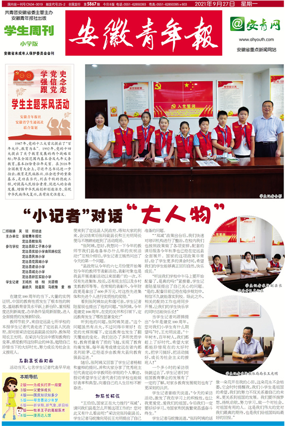 《安徽青年报·学生周刊》励志启智,开阔视野,净化心灵,陶冶情操,参与互动,集新闻性、知识性、趣味性、互动性为一体,是小学生成长的良师益友、参与互动的平台、沟通老师家长的纽带。