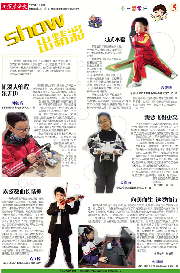 《安徽青年报·学生周刊》励志启智,开阔视野,净化心灵,陶冶情操,参与互动,集新闻性、知识性、趣味性、互动性为一体,是小学生成长的良师益友、参与互动的平台、沟通老师家长的纽带。