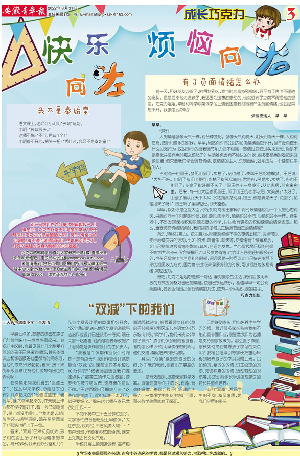 《安徽青年报·学生周刊》励志启智,开阔视野,净化心灵,陶冶情操,参与互动,集新闻性、知识性、趣味性、互动性为一体,是小学生成长的良师益友、参与互动的平台、沟通老师家长的纽带。
