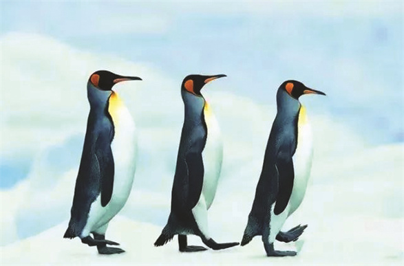 “瞧这两只帝企鹅走在冰面上那似魔鬼的步伐,真是可爱极了!”经过漫长的进化,帝企鹅形成了特殊的血液循环系统。它们在冰上行走时可以让脚掌向后倾斜,同时用楔形的尾巴保持身体稳定。这样,它们的脚趾不用接触到寒冷的冰,而尾部的羽毛没有血管分布,即使碰到冰面,也不会流失热量。