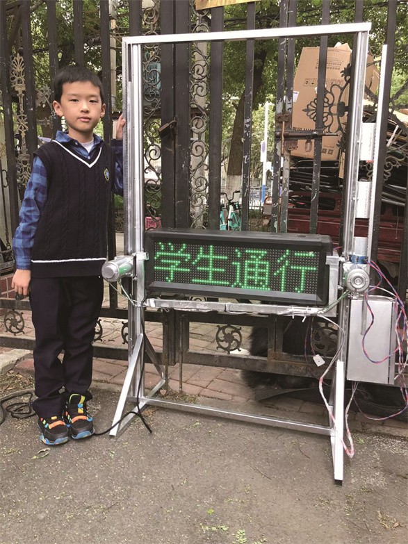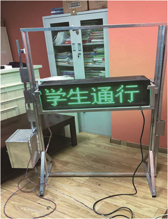 两根支架支撑结构主体,一块LED显示屏用来进行安全提醒,一个电动电机作为控制系统,这就是三位同学发明的“人车分离辅助装置”,一种基于电动控制的人车分流系统,如果该装置得到推广,可以有效避免交通事故的发生。