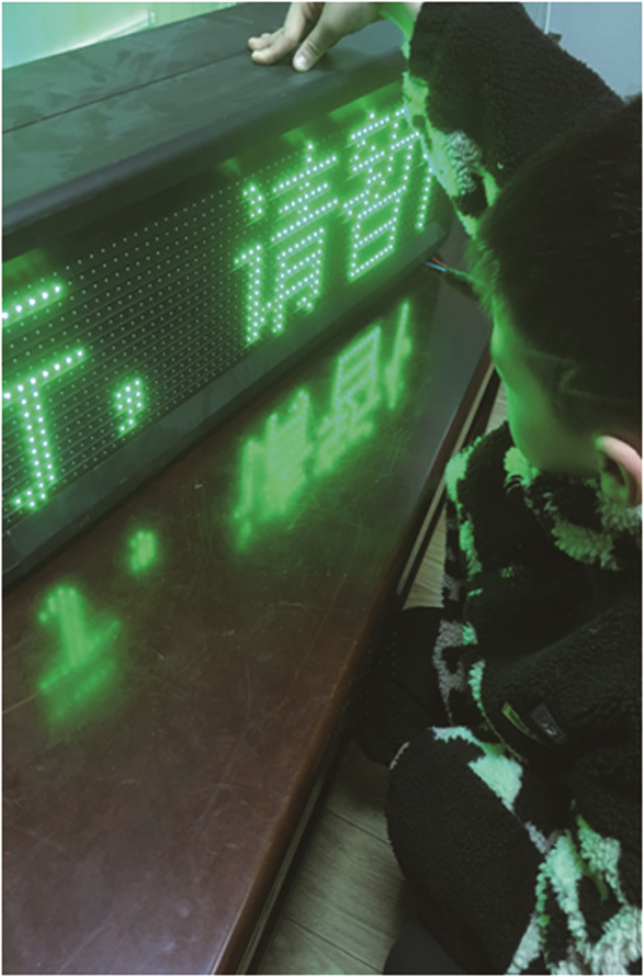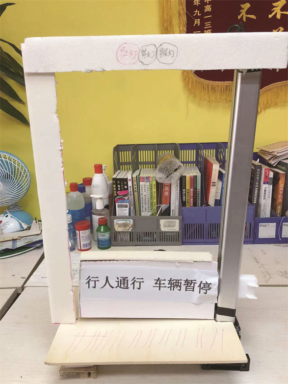 采访一开始,三位“小发明家”就争先恐后地向小J姐姐介绍装置的原理。卫君乐同学说:“当有人过马路时,按一下下落按钮,LED指示灯下落,就会挡住所有通行车辆,行人可以安全通过;无人通过马路时,按一下上升按钮,LED指示牌上升到两支架上端,不影响车辆的正常通行。”“LED指示牌为正反两面,两侧的车辆均可以看到,最大化地保证了车辆和行人的安全。”汪江山同学紧接着补充道。