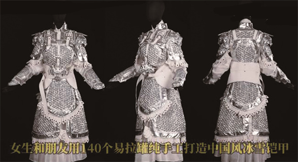 漫新闻 女孩用140个易拉罐打造冰雪铠甲 明朝铠甲款式、140个易拉罐、2600片鳞片…近日,四川成都女孩雁鸿和朋友耗时10天,用易拉罐纯手工打造了一副中国风冰雪铠甲。雁鸿介绍,灵感来源于谷爱凌在冬奥会穿的龙纹“战袍”,觉得谷爱凌很飒,想以此致敬驰骋冰雪的中国运动健儿。