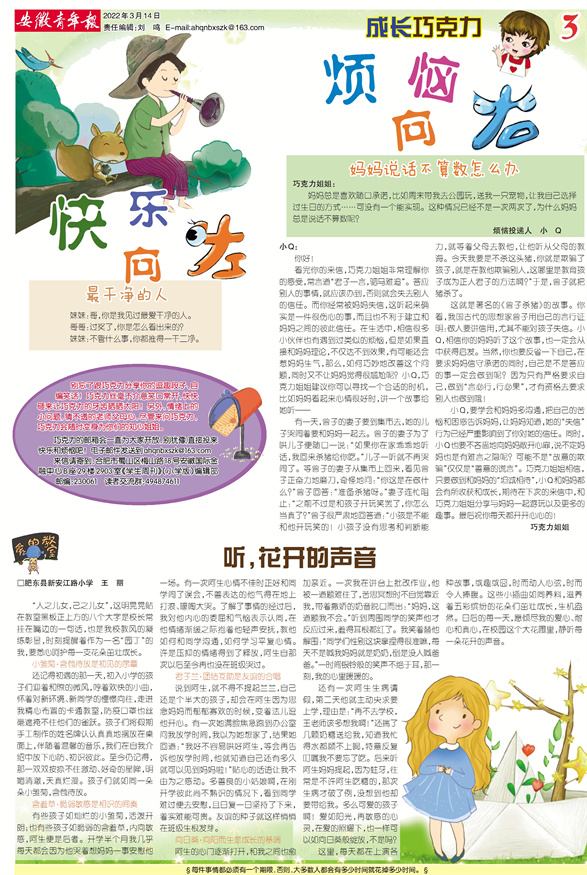 小Q,要学会和妈妈多沟通,把自己的苦恼和困惑告诉妈妈,让妈妈知道,她的“失信”行为已经严重影响到了你对她的信任。同时,小Q也要不吝啬地向妈妈敞开心扉,说不定妈妈也是有难言之隐呢?可能不是“故意的欺骗”仅仅是“善意的谎言”。巧克力姐姐相信,只要做到和妈妈的“坦诚相待”,小Q和妈妈都会有所收获和成长,期待在下次的来信中,和巧克力姐姐分享与妈妈一起游玩以及更多的趣事。最后祝你每天都开开心心的!