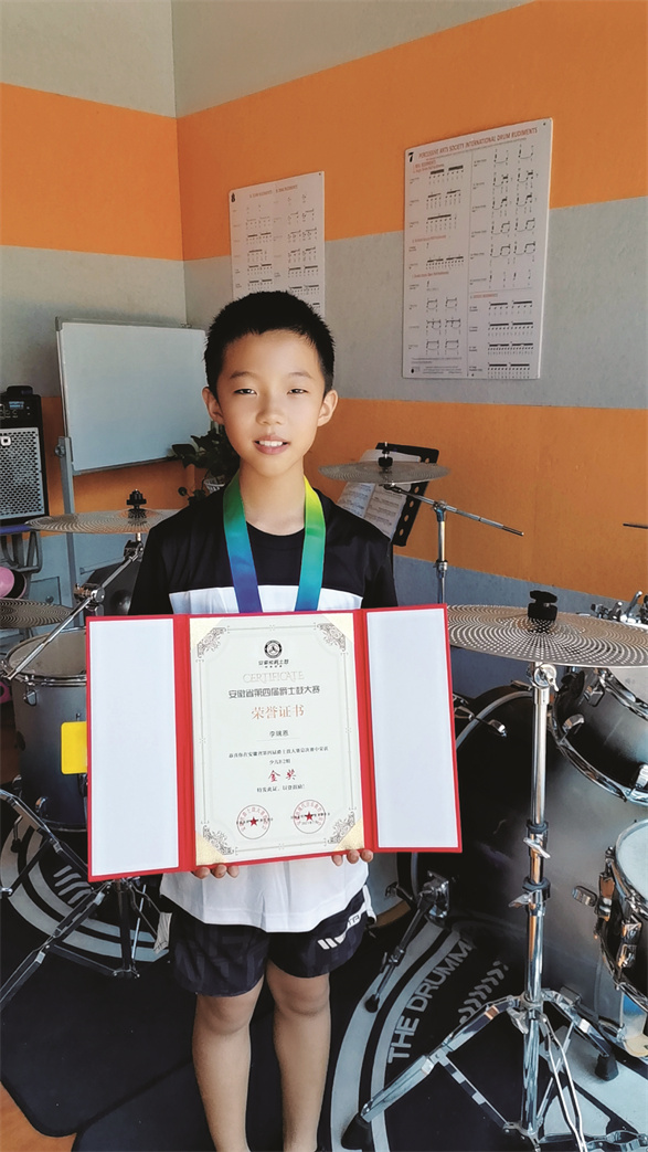 一年一度的安徽省爵士鼓大赛又到了。我在老师的指导下选择了两首难度较大的参赛歌曲。每天放学后,我就冲进琴行,一遍遍地练习参赛曲目,并仔细揣摩音乐节奏、手型手法、肢体语言和面部表情。从最初的手忙脚乱到后来的从容不迫,我一步一个脚印,努力地打磨着每一个演奏细节。老师看着我的表演,一开始总是双眉紧锁,后来偶尔表露出赞许之情。最后,当我达到人鼓合一的境界时,向来不苟言笑的老师第一次表扬了我,那一刻我可开心啦!