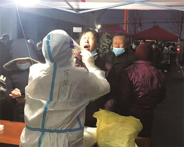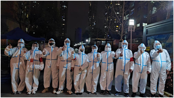 我的妈妈是一名医生,作为医务工作者,妈妈和她的同事负责为当地的居民采集核酸样本。他们每天必须穿着厚厚的防护服,戴着口罩、眼罩工作,每天工作十几个小时,因为不方便上厕所,所以尽可能地不喝水。每天采集完一个区域居民的核酸后,他们也只能匆匆忙忙吃上几口凉饭又奔赴下一个采集点,累的时候就只能靠在墙角休息一会儿,每天完成工作都已经是深夜了。