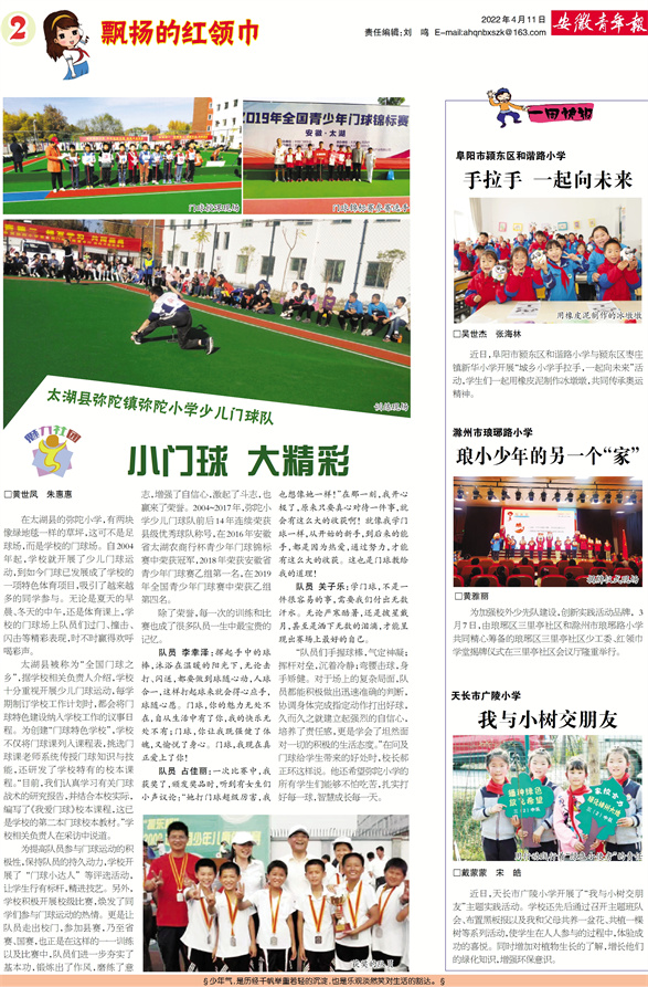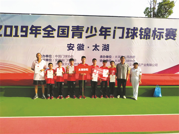 魅力社团 太湖县弥陀镇弥陀小学少儿门球队 小门球 大精彩 □黄世凤 朱惠惠 在太湖县的弥陀小学,有两块像绿地毯一样的草坪,这可不是足球场,而是学校的门球场。自2004年起,学校就开展了少儿门球运动,到如今门球已发展成了学校的一项特色体育项目,吸引了越来越多的同学参与。无论是夏天的早晨、冬天的中午,还是体育课上,学校的门球场上队员们过门、撞击、闪击等精彩表现,时不时赢得欢呼喝彩声。 太湖县被称为“全国门球之乡”,据学校相关负责人介绍,学校十分重视开展少儿门球运动,每学期制订学校工作计划时,都会将门球特色建设纳入学校工作的议事日程。为创建“门球特色学校”,学校不仅将门球课列入课程表,挑选门球课老师系统传授门球知识与技能,还研发了学校特有的校本课程。“目前,我们认真学习有关门球战术的研究报告,并结合本校实际,编写了《我爱门球》校本课程,这已是学校的第二本门球校本教材。”学校相关负责人在采访中说道。 为提高队员参与门球运动的积极性,保持队员的持久动力,学校开展了 “门球小达人” 等评选活动,让学生行有标杆,精进技艺。另外,学校积极开展校级比赛,焕发了同学们参与门球运动的热情。更是让队员走出校门,参加县赛,乃至省赛、国赛,也正是在这样的一一训练以及比赛中,队员们进一步夯实了基本功,锻炼出了作风,磨练了意志,增强了自信心,激起了斗志,也赢来了荣誉。2004~2017年,弥陀小学少儿门球队前后14年连续荣获县级优秀球队称号,在2016年安徽省太湖农商行杯青少年门球锦标赛中荣获冠军,2018年荣获安徽省青少年门球赛乙组第一名,在2019年全国青少年门球赛中荣获乙组第四名。 除了荣誉,每一次的训练和比赛也成了很多队员一生中最宝贵的记忆。 队员 李幸泽:挥起手中的球棒,沐浴在温暖的阳光下,无论击打、闪送,都要做到球随心动,人球合一,这样打起球来就会得心应手,球随心愿。门球,你的魅力无处不在,自从生活中有了你,我的快乐无处不有;门球,你让我既强健了体魄,又愉悦了身心。门球,我现在真正爱上了你! 队员 占佳丽:一次比赛中,我获奖了,颁发奖品时,听到有女生们小声议论:“她打门球超级厉害,我也想像她一样!”在那一刻,我开心极了,原来只要真心对待一件事,就会有这么大的收获啊!就像我学门球一样,从开始的新手,到后来的能手,都是因为热爱,通过努力,才能有这么大的收获。这也是门球教给我的道理! 队员 关子乐:学门球,不是一件很容易的事,需要我们付出无数汗水。无论严寒酷暑,还是披星戴月,甚至是洒下无数的泪滴,才能呈现出赛场上最好的自己。 “队员们手握球棒,气定神凝;挥杆对垒,沉着冷静;弯腰击球,身手矫健。对于场上的复杂局面,队员都能积极做出迅速准确的判断,协调身体完成指定动作打出好球,久而久之就建立起强烈的自信心,培养了责任感,更是学会了坦然面对一切的积极的生活态度。”在问及门球给学生带来的好处时,校长郝正环这样说。他还希望弥陀小学的所有学生们能够不怕吃苦,扎实打好每一球,智慧成长每一天。