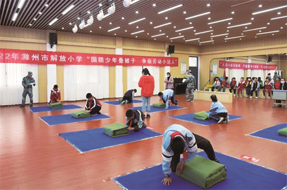近日,为激发同学们积极劳动的热情,提高同学们的劳动技能水平,滁州市解放小学结合自身“国防特色示范校”的特色,举行了一场别开生面的“国防少年叠被子 争做劳动小达人”劳动技能竞赛。最终10名队员脱颖而出,荣获校园十大“劳动小达人”称号。比赛结束后,有同学表示今后要注重培养自己的劳动意识和劳动技能,将来用自己勤劳、富有创意的双手,去回报父母和社会。