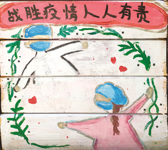 相比于人类与小动物的和谐相处,被命名为《隔空拥抱》的作品则显得更加贴近生活,用艺术作品讴歌奋战在疫情防控一线的最美逆行者!王子轩同学非常有自己的想法:“我创作这幅画的初衷是因为想到了新闻中曾报道过同是医护人员的夫妻二人,因为疫情的原因虽然都认出了彼此,但却不能拥抱彼此,他们隔空拥抱给对方加油鼓励。一起经历的生死,一起闯过的难关,都是最深刻的记忆,我想在他们真正相见时,一定会张开双臂,给对方一个真正的拥抱。”