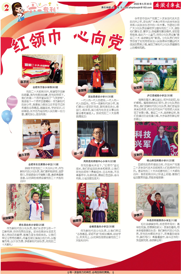 今年是中国共产党第二十次全国代表大会的召开之年,是包括广大青少年在内的全党全国各族人民政治生活中的一件大事。为团结引领广大少先队员迎接和学习宣传党的二十大,激励他们爱生活、爱学习,厚植爱党爱国情怀,坚定理想信念,值此六一儿童节,特向少先队员征集“喜迎二十大·奋进新征程”献词。少先队员们用文字抒发了对党带领全国人民取得举世瞩目伟大成就的赞美之情,展现了新时代少先队员健康向上的精神风貌。