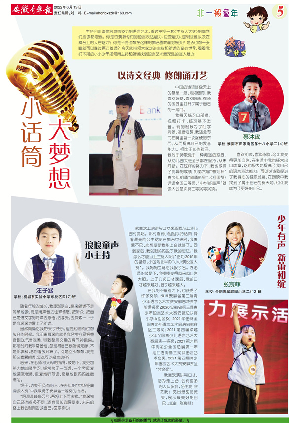 在我的不懈努力下,也获得了许多奖项:2019安徽省第二届青少年语言艺术大赛安徽总决赛学前组银奖;2020安徽省第三届青少年语言艺术大赛安徽总决赛小学A组金奖;2021华语杯全国青少年语言艺术展演安徽赛区二等奖;2021第四届卓越少年全国青少儿语言艺术大赛展演一等奖;2021第六届中传花少全国总展演一年组口语传播金奖及语言艺术金奖;2021第四届青少年语言艺术大赛安徽赛区“特金奖”。