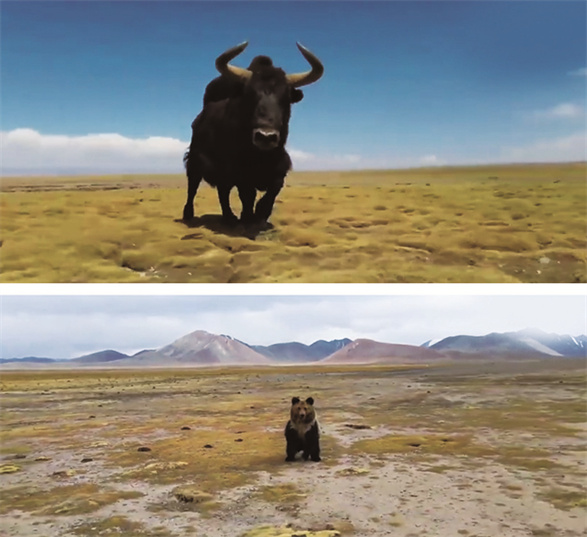 珍稀野生动物现身青海哈拉湖 近日,在青海省海西蒙古族藏族自治州德令哈市哈拉湖附近,发现国家二级保护动物西藏棕熊与国家一级保护动物野牦牛的身影。画面中,西藏棕熊对无人机的出现十分好奇,而野牦牛则对无人机十分警觉。
