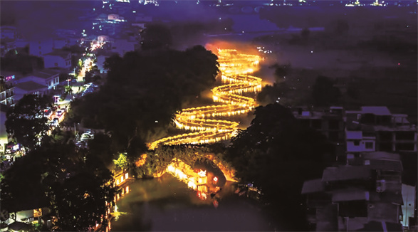 漫新闻 700米龙灯映山河 近日,广西桂林,一条由80张竹筏组成的700米金色“巨龙”在遇龙河中蜿蜒巡游,蔚为壮观。“巨龙”周围,万盏河灯点亮河面,和不远处绚丽绽放的烟花一起,照亮了夜幕下秀美的桂林山水,如梦似幻。