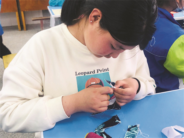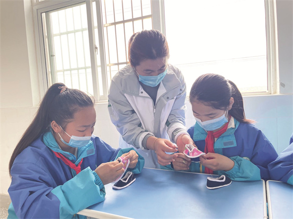 手工布鞋是古人留下来的一门老手艺,体现了中国古人的智慧。“打袼禙、画鞋样、剪鞋样、包边缝合,再把鞋面鞋底缝合在一起,一双手工布鞋就做好了。”老师边示范边向同学们讲解制作布鞋的步骤。