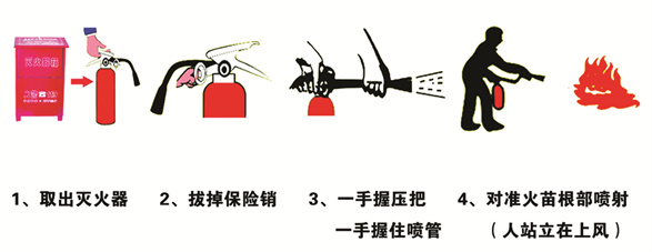 灭火器在使用时须拔下灭火器保险销,左手托住瓶底,右手握住把手,按下压把,背风方向对准火焰根部喷射。