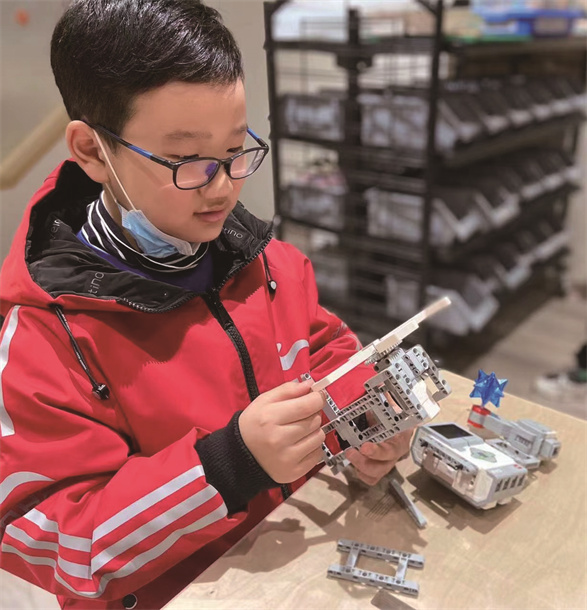 刚开始接触机器人编程时,我只会一些简单的拼装。进入系统性学习的时候,我理解了很多以前无法解释的知识和现象。各种传感器和编程设备让我深入了解了很多科技方面的知识。比如,我们搭建的机械狗,它需要选择超声波传感器,程序编写范围模块,在搭建逻辑上的切换完成整个程序指令,程序目的就是让机械狗与人维持一个距离。又比如距离设置20cm,当机械狗离人贴近20cm时机械狗会后退,反之则靠近,到达则暂停,模拟出犬类动物对于人类定吠、退吠、近吠的效果。学习机器人编程,我最大的收获是不仅动手能力提高了,同时也让我变得爱思考了。