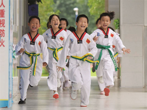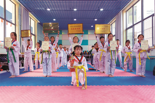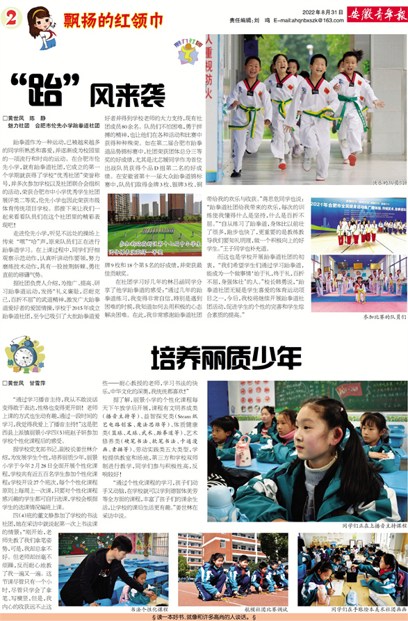 “跆”风来袭 □黄世凤 陈 静 魅力社团 合肥市伦先小学跆拳道社团 跆拳道作为一种运动,已被越来越多的同学所熟悉和喜爱,并逐渐成为校园里的一项流行和时尚的运动。在合肥市伦先小学,就有跆拳道社团,它成立的第一个学期就获得了学校“优秀社团”荣誉称号,并多次参加学校以及社团联合会组织的活动,荣获合肥市中小学优秀学生社团展评类二等奖,伦先小学也因此荣获市级体育传统项目学校。那接下来让我们一起来看看队员们在这个社团里的精彩表现吧! 走进伦先小学,听见不远处的操场上传来 “嘿”“哈”声,原来队员们正在进行跆拳道学习。在上课过程中,同学们仔细观察示范动作,认真听讲动作要领,努力磨练技术动作,具有一股披荆斩棘、勇往直前的磅礴气势。 据社团负责人介绍,为推广、提高、研习跆拳道运动,发扬“礼义廉耻,忍耐克己,百折不屈”的武道精神,激发广大跆拳道爱好者的爱国情操,学校于2015年成立跆拳道社团,至今已吸引了大批跆拳道爱好者并得到学校老师的大力支持,现有社团成员80余名。队员们不怕困难,勇于拼搏的精神,也让他们在各种活动和比赛中获得种种殊荣。如在第二届合肥市跆拳道品势锦标赛中,社团荣获团体总分三等奖的好成绩,尤其是沈芯嫒同学作为首位出战队员获得个品D组第二名的好成绩。在安徽省第十一届大众跆拳道锦标赛中,队员们取得金牌3枚、银牌3枚、铜牌9枚和18个第5名的好成绩,并荣获最佳贡献奖。 在社团学习好几年的林吕涵同学分享了他学跆拳道的感受:“通过几年的跆拳道练习,我变得非常自信,特别是遇到困难的时候,我知道如何去用积极的心态解决困难。在此,我非常感谢跆拳道社团带给我的欢乐与收获。”蒋思危同学也说:“跆拳道社团给我带来的欢乐,每次的训练使我懂得什么是坚持,什么是百折不屈。”“自从练习了跆拳道,身体比以前壮了很多,跑步也快了,更重要的是教练教导我们要知礼明理,做一个积极向上的好学生。”王子同学也补充道。 而这也是学校开展跆拳道社团的初衷, “我们希望学生们通过学习跆拳道,能成为一个做事情‘始于礼,终于礼,百折不屈,身强体壮’的人。”校长韩勇说,“跆拳道社团无疑是学生喜爱的体育运动项目之一,今后,我校将继续开展跆拳道社团活动,促进学生的个性的完善和学生综合素质的提高。”
