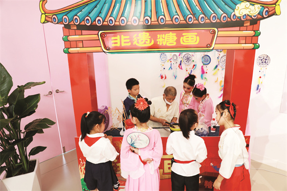 非遗糖画展区,学生们观看非遗传承人制作糖画
