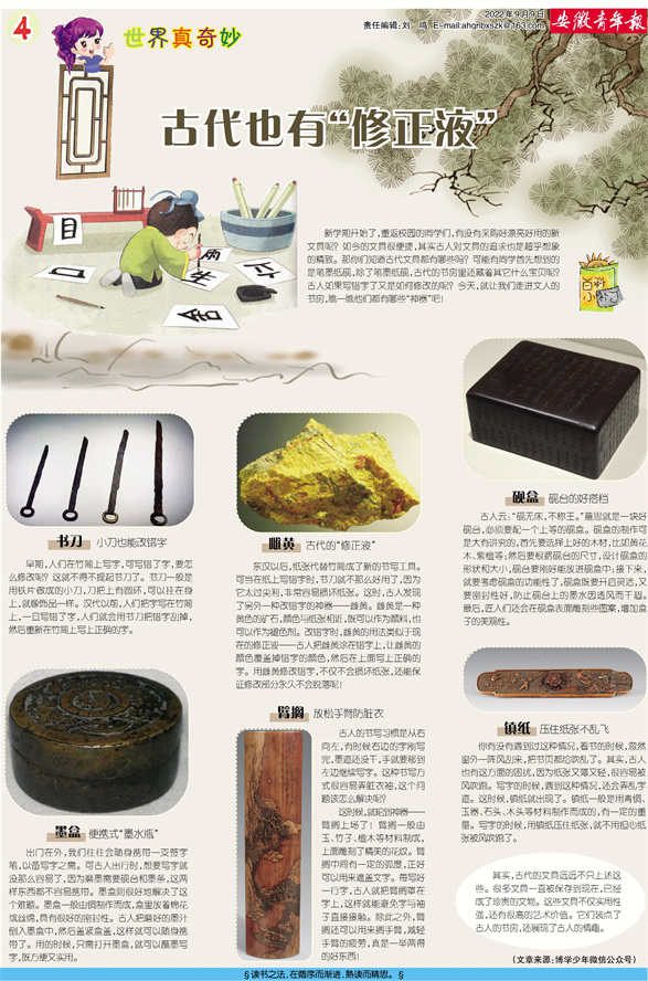东汉以后,纸张代替竹简成了新的书写工具。可当在纸上写错字时,书刀就不那么好用了,因为它太过尖利,非常容易损坏纸张。这时,古人发现了另外一种改错字的神器——雌黄。雌黄是一种黄色的矿石,颜色与纸张相近,既可以作为颜料,也可以作为褪色剂。改错字时,雌黄的用法类似于现在的修正液——古人把雌黄涂在错字上,让雌黄的颜色覆盖掉错字的颜色,然后在上面写上正确的字。用雌黄修改错字,不仅不会损坏纸张,还能保证修改部分永久不会脱落呢!