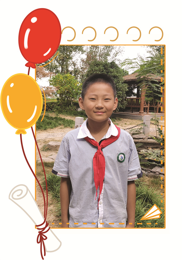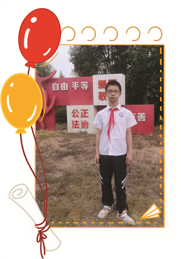 他爱好广泛,喜欢阅读、魔方、数独、围棋、吉他、羽毛球等,多次在校内运动会上取得良好成绩。在学校,他是老师的小帮手,是同学的好榜样。他总是把老师布置的工作放在心上,思考怎么把工作做好,有时遇到困难,就向老师和爸妈讨教怎么解决问题。课间,他处处以身作则,团结友爱,给同学们树立了良好的榜样。假期和爸爸一起打扫楼道、清理小区角落里的白色垃圾,为创建文明城市尽自己的绵薄之力。勤奋自律的同时,也让他收获了很多荣誉,是老师眼中懂事的“小大人”。