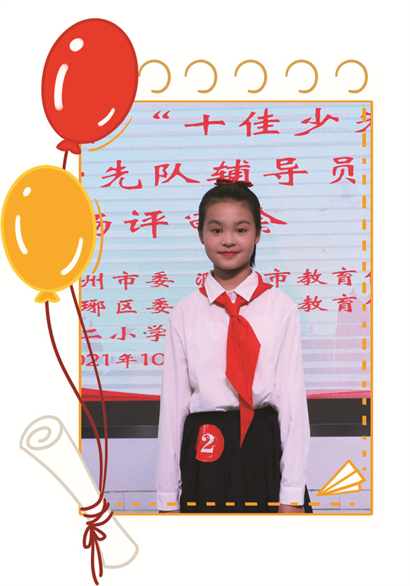 她积极参与校内外的少先队活动:2020年2月,在全国抗击新冠肺炎疫情期间,她以书信的形式表达了对钟南山爷爷和抗疫英雄们的感激和敬意,被安徽文明网选登;2021年4月,她和队员们共同表演的《不忘初心的少年》获得琅琊区红色童谣传唱活动第一名。2022年,参加琅琊区首届红领巾“小喇叭”讲解员比赛和“请党放心 强国有我”琅琊区第三届少先队文明礼仪风采展示活动,均得到了第一名的好成绩,她也因此获得“三星讲解员”和“文明礼仪小标兵”的称号。她还经常参加红领巾广播站小主播、“世界地球日”国旗下讲话、党史馆志愿讲解员培训、琅琊区少代会等少先队活动。