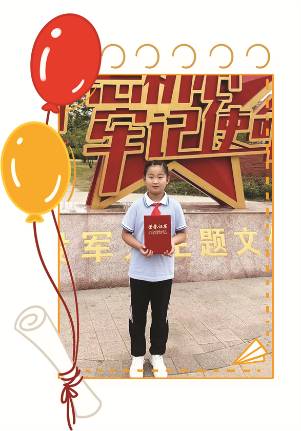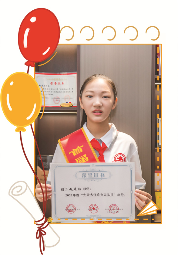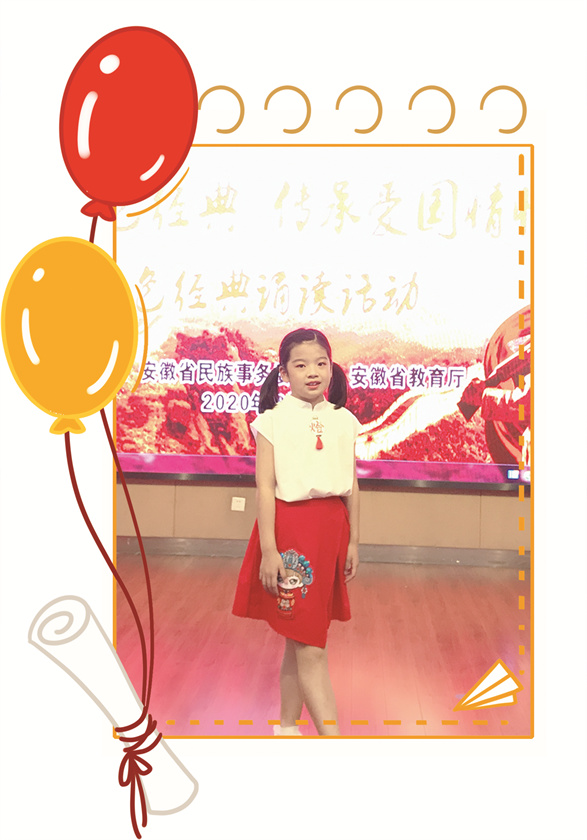 近年来,她主持多场省市级少儿晚会、主题队日活动,多次代表学校参加省、市、区级各类演讲、朗诵及书画比赛并屡获佳绩,以其优异的表现,获得大家的一致肯定。她先后获得2020年度“宿州市优秀少先队员”、2021年度“安徽省优秀少先队员”、2022年宿州市“学雷锋做先锋·争做新时代好队员”优秀实践队员、首届“宿州百名好少年”等荣誉称号。