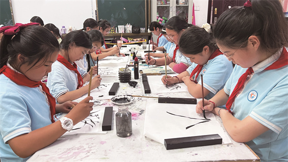 据了解, 队员们从认识中锋、侧锋开始,通过画蚊香圈练习控笔,再慢慢临摹梅花、兰草、金鱼等简单图案。社团辅导老师刘沥总爱从最基础的工具教起:“毛笔要像握鸡蛋那样轻轻捏住,宣纸吸水快,运笔要又快又稳。”当第一片能随风摆动的竹叶出现在纸上时,整个教室都会响起惊喜的欢呼声。
