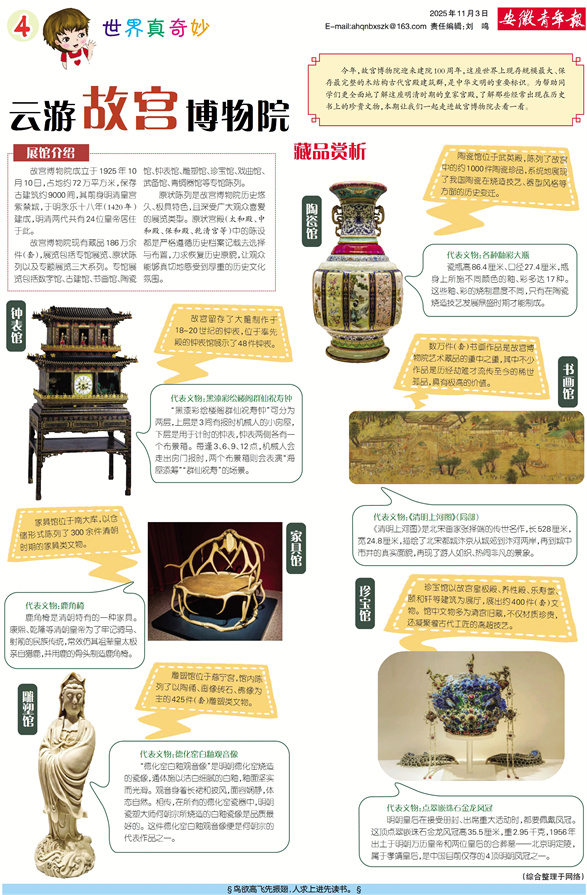 今年,故宫博物院迎来建院100周年,这座世界上现存规模最大、保存最完整的木结构古代宫殿建筑群,是中华文明的重要标识。为帮助同学们更全面地了解这座明清时期的皇家宫殿,了解那些经常出现在历史书上的珍贵文物,本期让我们一起走进故宫博物院去看一看。