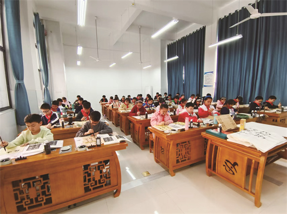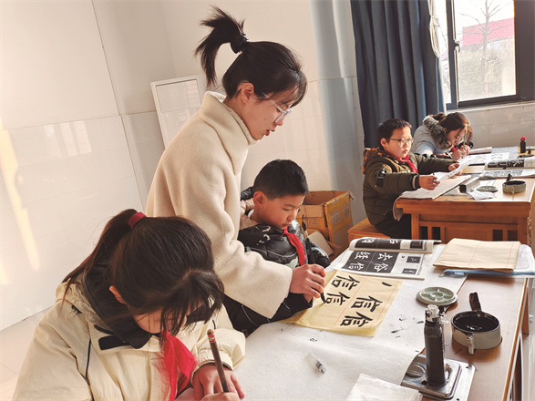 魅力社团 笔墨润童心 □魅力社团 肥东县实验小学浮槎路校区书法社团 “横如扁担稳当当,竖似青松直挺挺。”肥东县实验小学浮槎路校区书法教室内常飘墨香,该社团于2022年10月依托课后服务组建,由王俊、谢天、陈梦3位教师指导48名三至六年级社员,以“以艺化人、以艺育规、以艺养德”为初心,让传统文化浸润童心。 社团采用分层选拔模式,优先吸纳有基础或兴趣浓厚的学生,配备专用教室与全套工具,建立“双姿训练—笔画练习—作品创作”培养体系。通过“坐姿操”“执笔口诀”矫正习惯,“每日一字”夯实基础,针对“临摹与创作脱节”难题,开展背帖训练助学生突破瓶颈。 社员们在墨香中实现蜕变。六(17)班的褚天宏初入社团时写字时头歪到左边,纸也跟着斜成“滑梯”。在每周的双姿训练课上,老师让他头顶书本练坐姿,手腕绑橡皮筋纠正握笔姿势。经过每天放学后20分钟的练习,褚天宏的楷书作品《静夜思》最终在学校举办的艺术节上脱颖而出,被贴在学校走廊处展览。 社团通过校内比赛、作品展及“进社区写春联”等活动锤炼社员,还积极组织社员参加各级各类书法比赛。方煜轩在第四届“笔墨中国”汉字书写比赛中获省二等奖;洪亦寒和孙睿轩在安徽省第七届“逐梦新时代 笔墨展风采”书法比赛中获省二等奖。 “习字立人,墨润童心——在笔锋起落间传承文化根脉,于横竖撇捺中涵养人生品格。”校长王俊的寄语,正是社团的育人写照。社团以润物无声之力,让少年在笔墨中汲取自信、锤炼品格,让文脉传承不息。