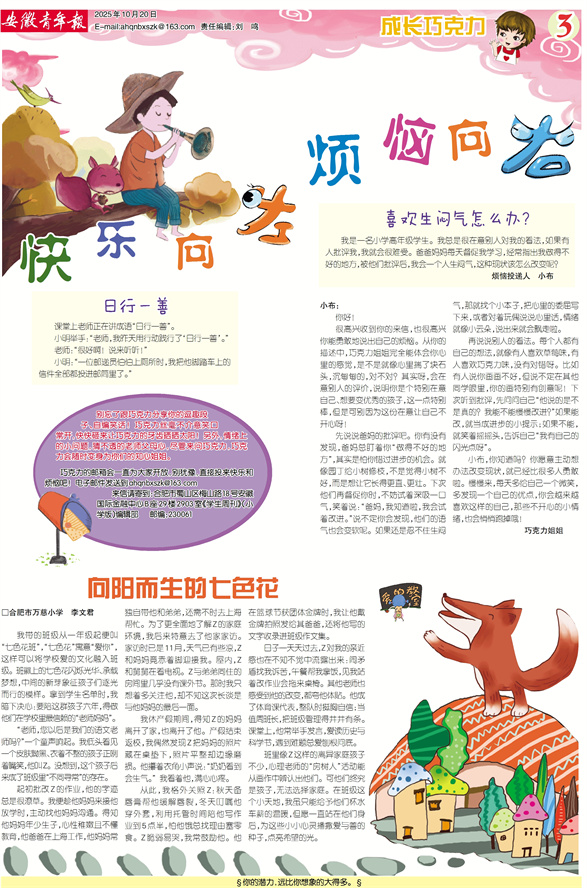 《安徽青年报·学生周刊》励志启智,开阔视野,净化心灵,陶冶情操,参与互动,集新闻性、知识性、趣味性、互动性为一体,是小学生成长的良师益友、参与互动的平台、沟通老师家长的纽带。