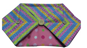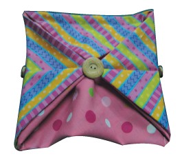 6.将另一侧的三角形也按同样的方法折起来,折起来的两个角在中间相遇,并在上面缝合大木扣,两边缝合小木扣固定。