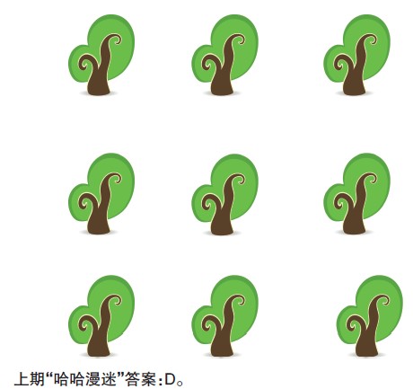 哈哈漫迷 小树排排站 今年的树儿你栽了几棵?别着急,时间还很长,动手时间长,那就一起来动动脑吧!劳逸结合会帮助调节你的身体,减轻疲劳哦!所以,请别钻进电视剧里就不出来,掉进漫画里就不上来!糖果真是多心,这一点叮嘱对你来说一定多余! 糖果的题目简短却不简单,如何让9棵树排成10行?这10行可以是横线、竖线,也可以是斜线。怎么样,有头绪没?排排看吧,究竟让这9棵树怎么站才符合要求呢?(答案下期找)