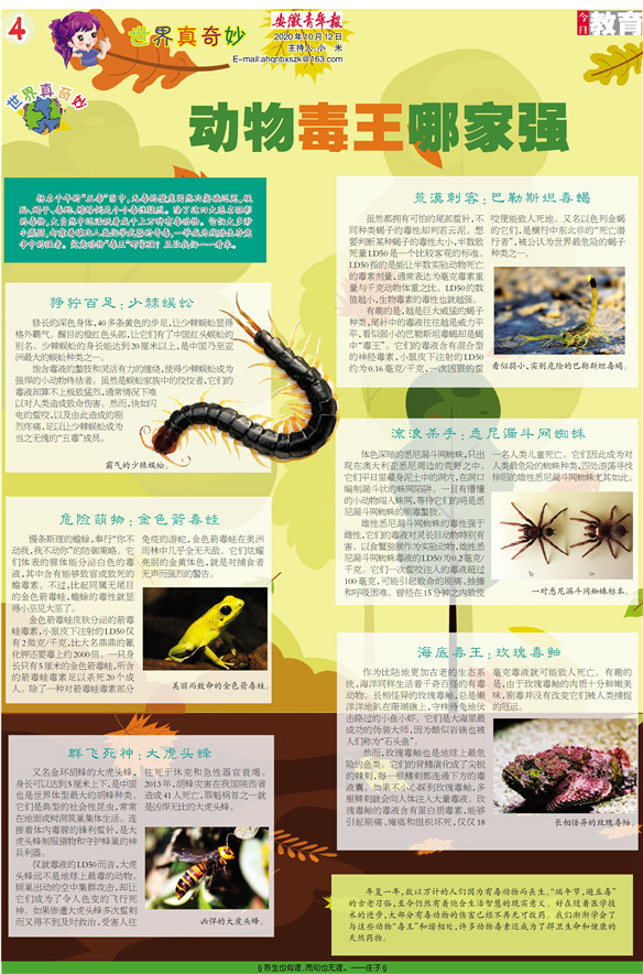扬名千年的“五毒”当中,无毒的壁虎固然比窦娥还冤,蜈蚣、蝎子、毒蛇、蟾蜍倒是个个毒性猛烈。除了这四大恶名昭彰的毒物,大自然中还活跃着成千上万种有毒动物。它们大多渺小羸弱,却靠着堪比人类化学武器的奇毒,一举成为残酷生存竞争中的强者。究竟动物“毒王”哪家强?且让我们一一看来。