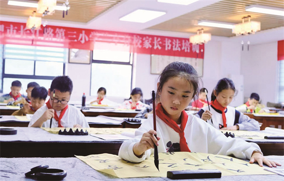 魅力社团 墨香时光 □魅力社团:合肥市长江路第三小学兰亭分校书法社团 “哇,咱们学校的书法教室也太漂亮啦!”合肥市长江路第三小学兰亭分校二年级的同学们一踏入书法教室,便发出阵阵惊叹。古色古香的栗色条案与木凳整齐排列,案上的毛毡浸满墨痕,与毛笔、砚台相互映衬。米色宫灯悬于头顶,柔和的光芒倾洒而下,散发着古朴雅致的气息。墙上挂满的书法作品,笔走龙蛇间尽显方寸之美……这里,便是合肥市长江路第三小学兰亭分校书法特色社团的教室。 据学校负责教学管理的副校长阮莉介绍,2006年,在争创国家级书法教育特色学校的进程中,“兰亭书法社团”应运而生。作为国家级书法教育示范学校的核心阵地,兰亭人始终秉持“翰墨养正,诗书化人”的育人理念,立志打造一座以翰墨滋养童心的文化殿堂。在这片天地里,书法不仅是线条与墨色的艺术呈现,更是中华文脉的生动延续,是培育“认认真真写字,堂堂正正做人”的兰亭新时代少年的重要路径。 社团自成立至今,已走过十九载岁月。六(2)班的汪雨琦满怀深情地说:“毛笔书法社团,是我与传统文化最美的邂逅之地。曾经,横竖撇捺的练习枯燥又艰难,如今,我的笔下已能写出流畅自然的字迹。在悠悠墨香中,我触摸到了汉字的深厚底蕴,更从中领悟到诸多人生哲理。这段与毛笔相伴的时光,是我成长路上最珍贵的馈赠。”五(2)班的王梓骞也兴奋地分享道:“每次拿起毛笔,蘸墨于宣纸之上书写,内心便满是宁静与喜悦。书法的魅力,深深吸引着我。在兰亭,我有幸遇到了对我影响深远的书法老师,他不仅传授我书法技巧,更教会我如何以书法传情达意。” 据社团负责人介绍,从在庐阳区首届社团展演中荣获“优秀展演奖”,到在安徽省素质教育成果展上得到赞许,兰亭人不断将书法之艺从课堂推向更广阔的舞台。社团的同学们在各类赛事中表现优异,累计23人次荣获国家级奖项,500人次斩获省、市、区级嘉奖。此外,社团连续十八年开展“墨香送福”义务写春联活动,同学们挥毫泼墨,书写并送出超5000副春联,成为春节里一道温暖人心的风景线。如今的兰亭书法社团,在传承文脉中培育新苗,在精耕细耘中助力成长,兰亭的书法少年们于四方舞台绽放光彩,彰显担当。