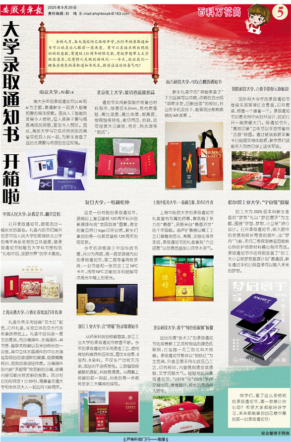 金秋九月,各大高校均已陆续开学,2025年的录取通知书可以说是让人眼前一亮再亮。有可以直接点燃出现校训的创意款,有建校120周年的限定款,有把梦想带上太空的浪漫系,还有将人生规划游戏化……今天,就让我们一睹各具特色的录取通知书风采,提前沾沾这份喜气吧!南京大学:AI和ai