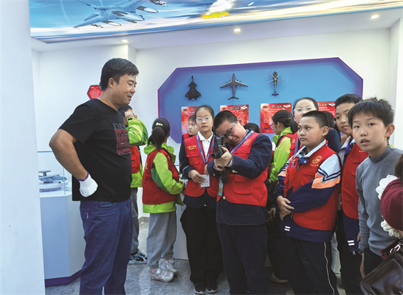 步入展厅,一架精致逼真的歼-10战斗机模型瞬间吸引了所有同学的目光,大家的问题也随之而来。“馆长,我们馆里有歼-20吗”“馆长,导弹是怎么飞上天的,我们现在最厉害的导弹是哪个型号”……