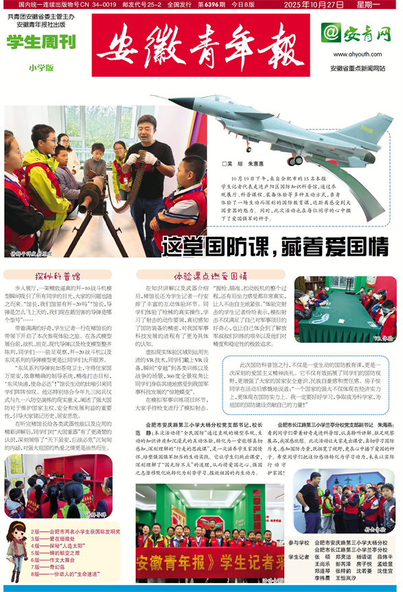 10月19日下午,来自合肥市的15名本报学生记者代表走进庐阳区国防知识科普馆,通过参观展厅、科普课程、装备体验等多种互动方式,亲身体验了一场生动而深刻的国防教育课,近距离感受到大国重器的魅力。同时,此次活动也在每位同学的心中撒下了爱国强军的种子。