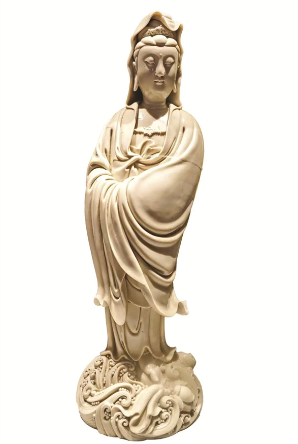 “德化窑白釉观音像”是明朝德化窑烧造的瓷像,通体施以洁白细腻的白釉,釉面坚实而光滑。观音身着长裙和披风,面容娴静,体态自然。相传,在所有的德化窑瓷器中,明朝瓷塑大师何朝宗所烧造的白釉瓷像是品质最好的。这件德化窑白釉观音像便是何朝宗的代表作品之一。