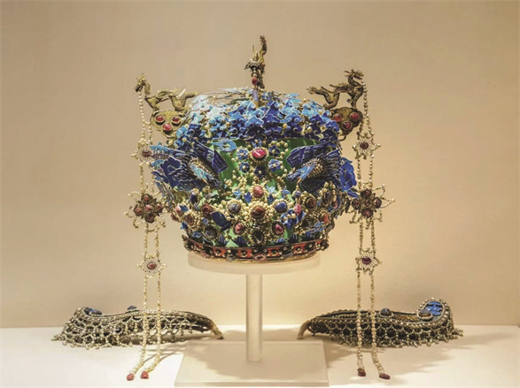 明朝皇后在接受册封、出席重大活动时,都要佩戴凤冠。这顶点翠嵌珠石金龙风冠高35.5厘米,重2.95千克,1956年出土于明朝万历皇帝和两位皇后的合葬墓——北京明定陵,属于孝靖皇后,是中国目前仅存的4顶明朝凤冠之一。