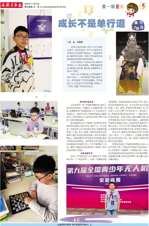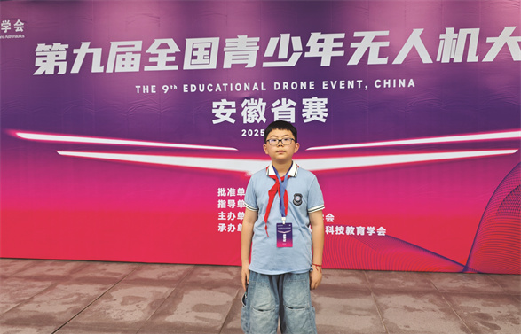 与许多同学一样,尹俊熙热爱科技,痴迷于用代码对话未来。从接触无人机编程的那一刻起,他便被这种“用逻辑创造飞行”的科技艺术深深吸引。2025年5月,尹俊熙带着自己编写的无人机程序参加了合肥市选拔赛,荣获二等奖,并成功晋级省赛。