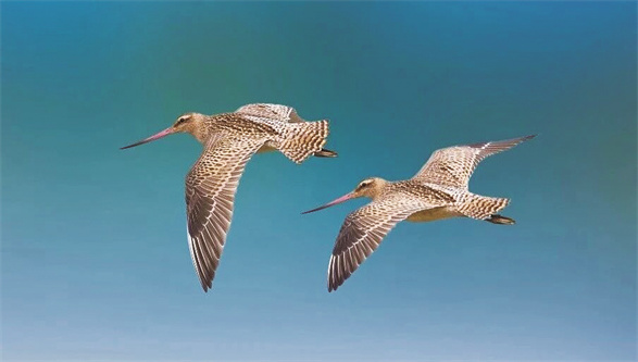 斑尾塍(chénɡ)鹬(yù)创造了迄今为止已知动物中不间断飞行距离最长的纪录。每年秋天,斑尾塍鹬会从阿拉斯加飞行11000千米左右,到达新西兰和澳大利亚的越冬地,中间不吃、不喝、不休息,连续飞行数天。