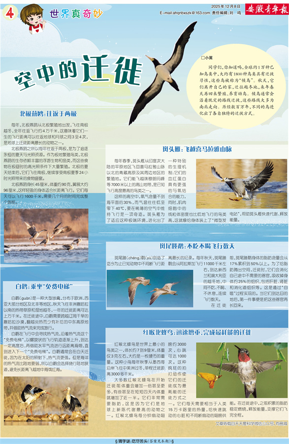 同学们,你知道吗,全球约1万种已知鸟类中,大约有1800种鸟类具有迁徙习性,这些鸟被称为“候鸟”。秋天,它们离开自己的家,迁往越冬地,来年春天再回来繁殖、养育幼鸟。候鸟通常会沿着既定的路线迁徙,这些路线大多为南北走向。历经数百万年,不同的鸟进化出了各自独特的迁徙方式。