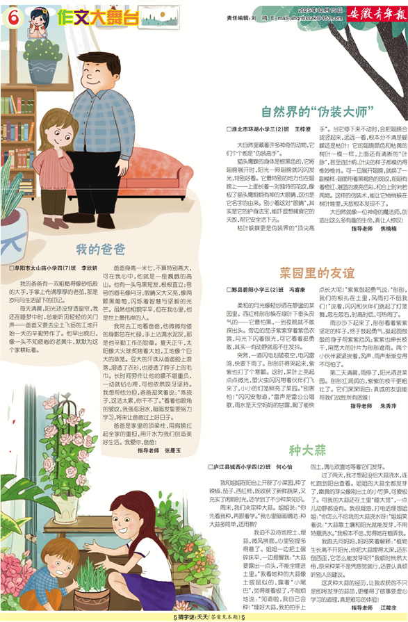 菜园里的友谊 □黟县碧阳小学三(2)班 冯睿康 柔和的月光像轻纱洒在静谧的菜园里。西红柿彤彤躲在绿叶下垂头丧气的——它最怕黑,一到夜晚就不敢探出头。旁边的茄子紫紫穿着紫色衣裳,月光下闪着银光,可它看着挺勇敢,其实一有动静就忍不住发抖。 突然,一道闪电划破夜空,电闪雷鸣,快要下雨了。彤彤吓得哭起来,紫紫也打了个寒颤。这时,菜叶上亮起点点微光,萤火虫闪闪带着伙伴们飞来了,小小的灯笼照亮了菜园。“别害怕!”闪闪安慰道,“雷声是雷公公唱歌,雨水是天空妈妈的甘露,喝了能快点长大呢!”紫紫鼓起勇气说:“彤彤,我们的根扎在土里,风雨打不倒我们!”说着,闪闪和伙伴们跳起了灯笼舞,忽左忽右,时高时低,可热闹了。 雨沙沙下起来了,彤彤看着紫紫坚定的样子,终于鼓起勇气,挺起圆鼓鼓的身子帮紫紫挡风;紫紫也伸长枝干,用宽大的叶片为彤彤遮雨。两个小伙伴紧紧挨着,风声、雨声渐渐变得不可怕了。 第二天清晨,雨停了,阳光洒进菜园。彤彤红润润的,紫紫的枝干更粗壮了。它们深深明白:真诚的友谊能帮我们战胜所有困难! 指导老师 朱秀萍